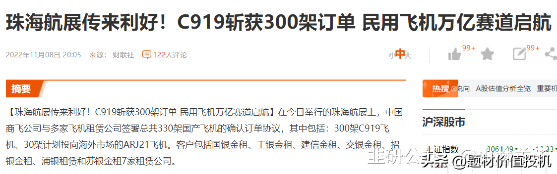 是300架C919国产大飞机和170亿美元空客这两个超级大订单的