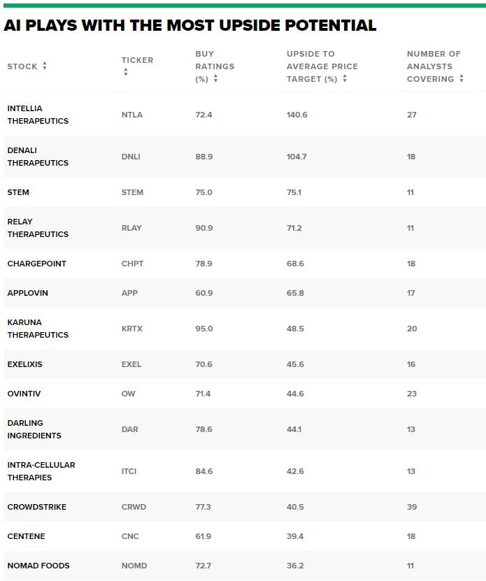 在这88家公司中,有30家被至少75%的分析师评为“买入”。在这份名单中,根据分析师们所预测的未来12个月的上涨潜力,列出了如下20只最值得推荐的AI股票: