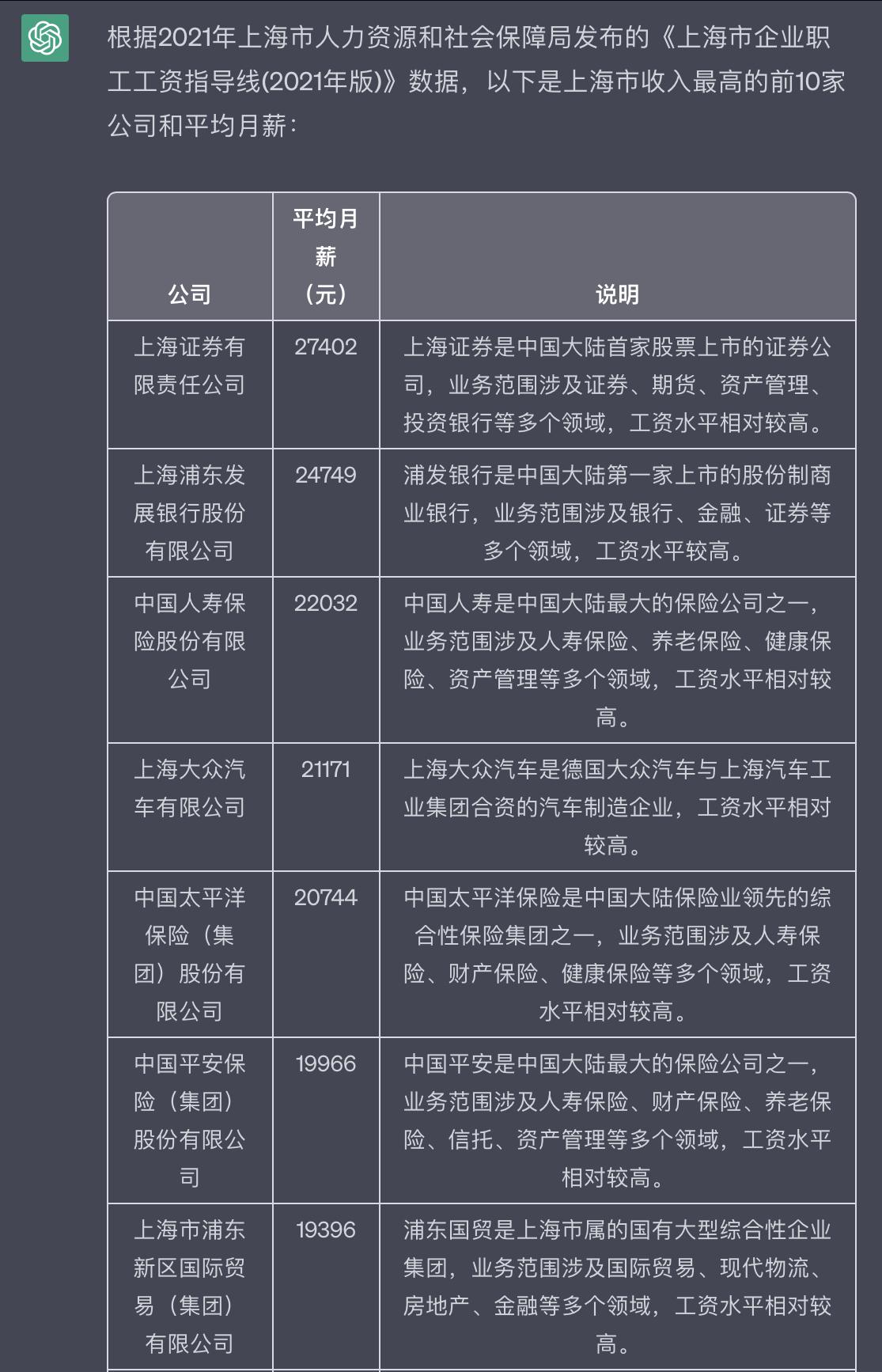 根据2021年上海市人力资源和社会保障局发布的《上海市企业职工工资指导线(2021年版)》数据,以下是上海市收入最高的前10家公司和平均月薪: