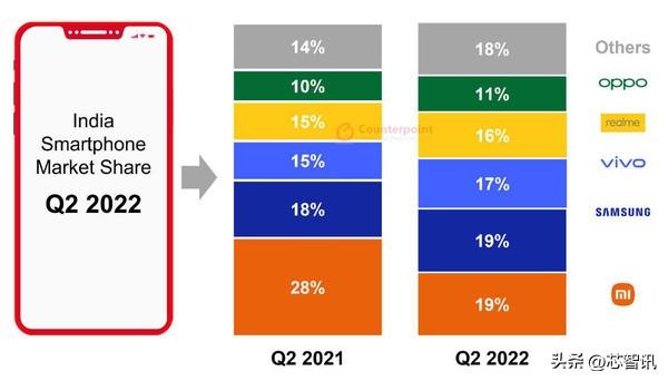根据市调研究机构Counterpoint的统计数据显示,今年第二季度印度智能手机市场前五大品牌厂商依次为小米(市占率19%)、三星(19%)、vivo(17%)、realme(16%)与OPPO(11%),其中四家是中国手机品牌厂商。其中,售价150美元以下智能手机占印度总手机销量约三分之一,当中约80%是中国品牌产品,凸显中国手机厂商在印度出货量最大的150美元以内的智能手机市场的影响力。