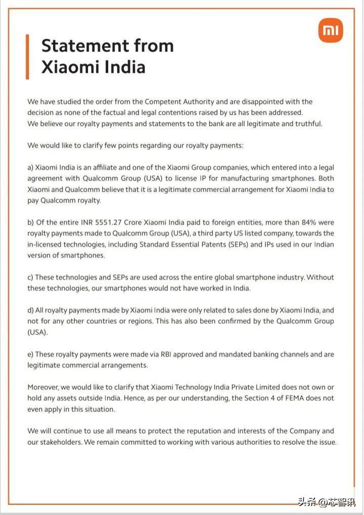 该声明还表示,执法局今年早些时候扣押的555.1亿印度卢比中,超过84%是支付给美国芯片公司高通集团的特许专利费用。小米印度是小米集团的子公司,与高通公司签订了法律协议,授权其生产智能手机的相关知识产权。在这份声明还表示,小米和高通均认为,小米印度向高通支付专利费是合法的商业程序。