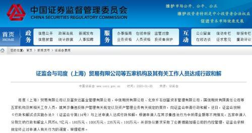 证监会1月20日发布了今年的1号公告,司度(上海)贸易有限公司以及富安达基金管理有限公司、中信期货有限公司、北京千石创富资本管理有限公司、国信期货有限责任公司等五家机构及其相关工作人员,就其涉嫌违反账户管理有关规定以及资产管理业务有关规定的案件,向证监会申请行政和解。