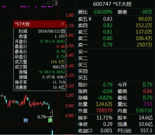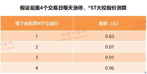 截至收盘,*ST大控收报0.79元,已连续16个交易日低于1元。根据测算,即便未来4个交易日每天都涨停,股价也仅有0.96元,不可能回到1元面值,从而触发面值退市规定。