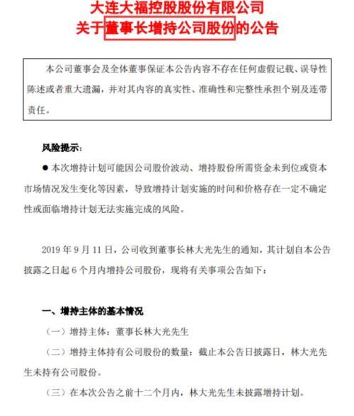 9月11日晚间,*ST大控称,公司董事长林大光拟通过上交所证券交易系统允许的方式(包括但不限于集中竞价和大宗交易的方式)增持公司股份,拟增持公司股份金额不少于人民币5,000万元,不超过人民币20,000万元,实施期限为自2019年9月12日起的6个月内。