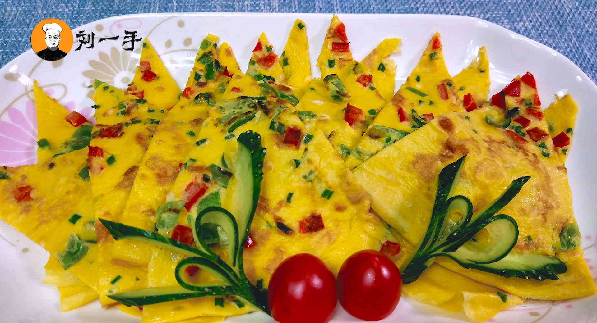 6、等蛋液全部凝固在一起底部微黄即可翻面,等另一面熟透即可拿出切片装盘。一盘既好看又好吃的鸡蛋煎饼就做好了