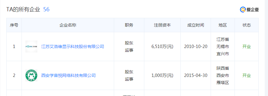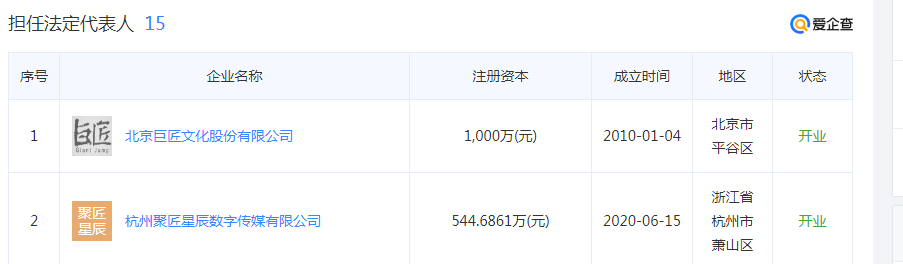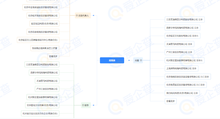 46岁的胡海泉名下共有56家企业,其中15家担任法人,27家担任股东,共投资45家,50%以上控股的共有5家,涉及影视文化、传媒、音乐、餐饮、网络科技等多个领域。