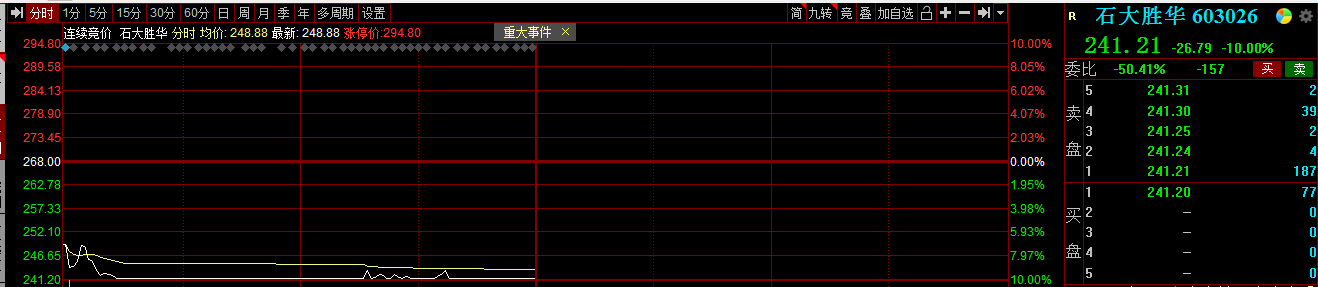10月15日,石大胜华(603026)盘中跌停,一日蒸发近54.3亿元。截至发稿,公司股价为241.21元,市值为488.9亿元。