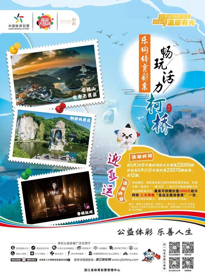 购彩者在浙江省内体彩实体店,采用长票(指定为“一票10注”)投注方式购买超级大乐透且单票满20元(多期票仅首期参与),即有机会获得最高价值为5888元柯桥三天两晚“亚运主题游”套票。