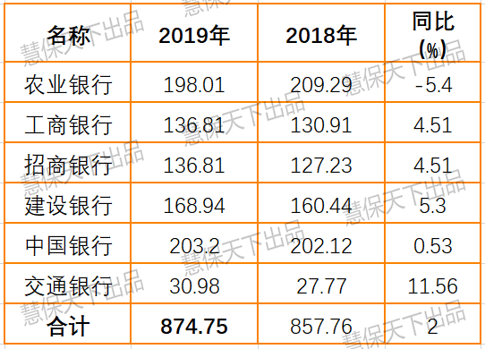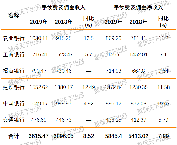 近期,6家上市银行农业银行、工商银行、招商银行、建设银行、中国银行、交通银行相继发布2019年年报,揭示了各自在代理保险业务方面的具体表现。