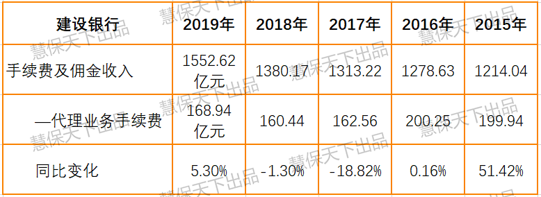 建设银行既没有公布具体的代销保费收入情况,也未公布具体的代销保险的手续费及佣金收入情况,但从其公布的历年代理业务手续费情况来看,2017年大幅负增长、2018年继续负增长,2019年有所回温,与农业银行、工商银行、招商银行代销保费收入增速类似,而从其年报的相关阐述来看,代销保险的手续费及佣金收入已经成为影响其代理业务手续费收入的重要因子: