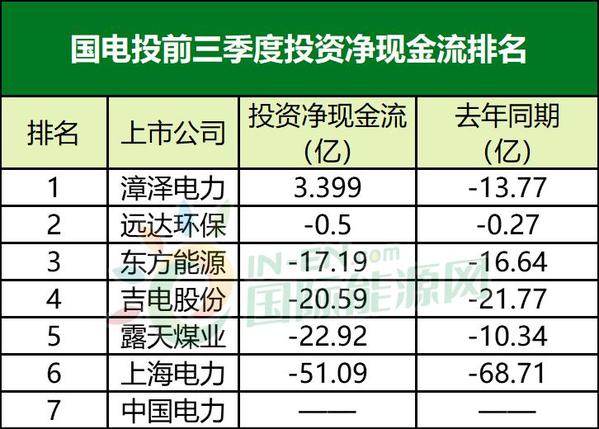 从投资净现金流看,只有漳泽电力进入到投资回收期,投资净现金流为正数,该公司前三季度收回投资收到的现金有33.8亿。其余公司的投资净现金流均为负值。上海电力投资净现金流数额最低,为-51.09亿。不过尽管如此,上海电力已有项目投资进入回收期, 今年前三季度收回投资收到的现金有4.76亿,比去年同期增加4.56亿 , 因此公司的投资净现金流较去年同期有所增长。