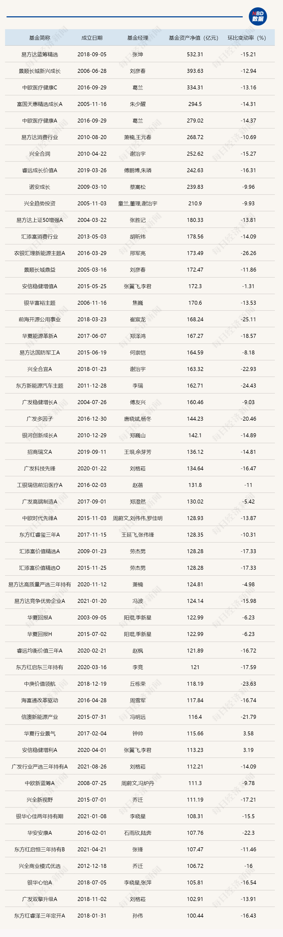 在这样的背景下,即便是管理规模超百亿的明星基金也普遍被投资人减持、规模几乎全部出现了缩水。根据每经记者的统计,三季度规模缩水超过20%的基金达到了8只,其中缩水最多的环比下降了26.26%。而从规模变动的具体数值来看,缩水最多的一只单季下降了近百亿元,可以说遇到了较大的净赎回、投资者获利兑现情绪较浓。