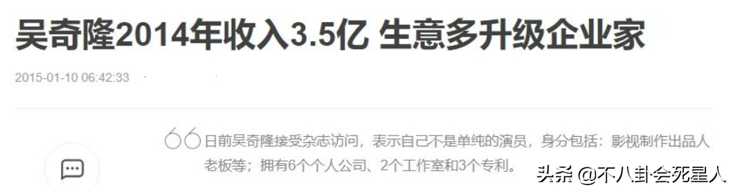 而且吴奇隆旗下的“商业版图”不止影视公司,加上其他领域的投资,他曾经透露自己的年收入高达3.5亿,这个收入可以说是妥妥的“富豪级别”了。