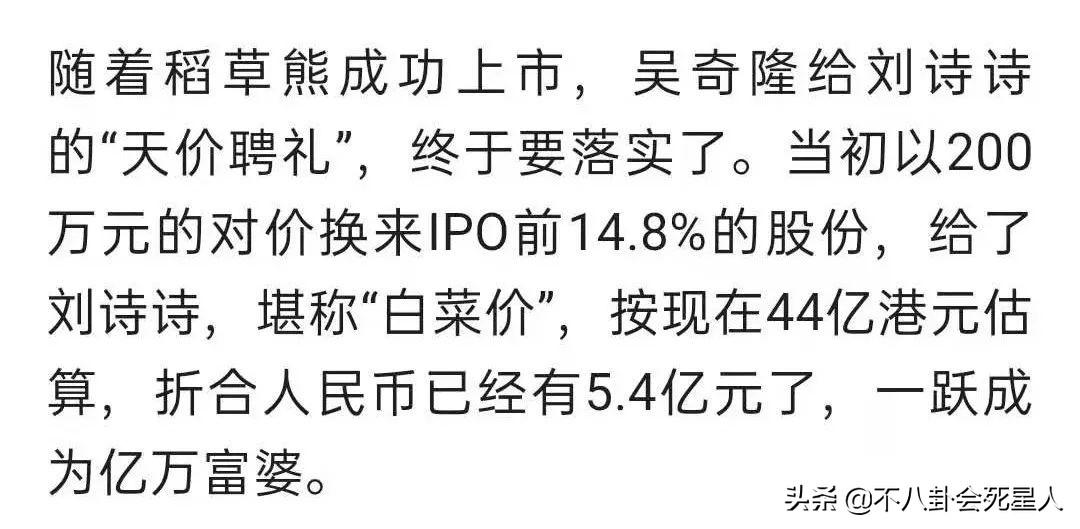 吴奇隆还送了刘诗诗一份“天价聘礼”,那就是他公司价值1.5亿左右的股份,这个手笔在明星中可以说是罕见。后来吴奇隆的公司成功上市,刘诗诗这1.5亿股份暴涨到5.4亿,直接让刘诗诗变成“圈中女富豪”,难怪刘诗诗没什么事业心了。