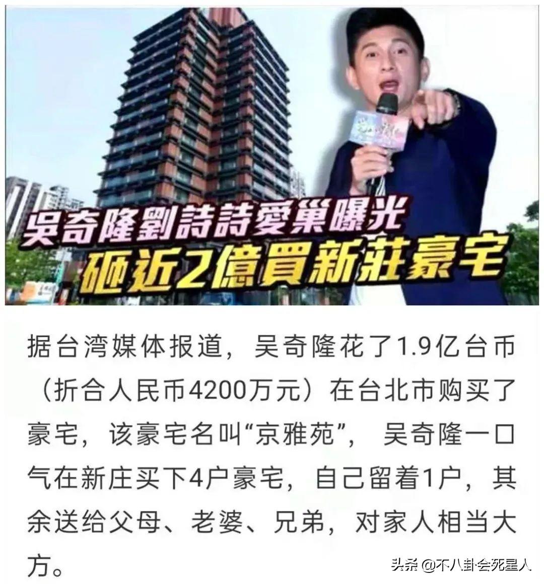 身家丰厚的吴奇隆对家人也是十分大方,据悉,吴奇隆在台北买了四套总值2亿的豪宅,除了一套留给他和刘诗诗夫妻住,其他三套给父母和兄弟住。