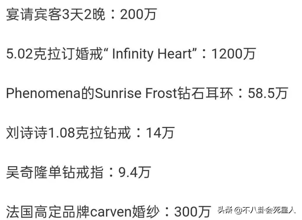 吴奇隆对妻子刘诗诗也很豪爽,他和刘诗诗结婚的时候,订婚戒指1200万,婚纱300万,耳环58万,一场婚礼办下来花了近2000万,而且吴奇隆壕气地表示,不收宾客们的礼金只收祝福。
