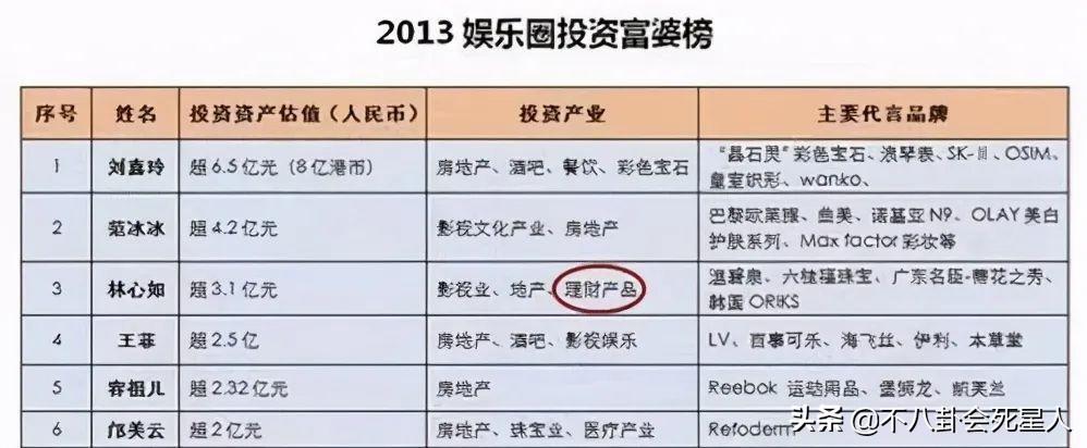除了投资拍戏,林心如还投资房地产等其他领域的生意。2013年,她曾经入选“2013年娱乐圈投资富婆榜”,投资资产超过3亿,比天后王菲还厉害。而外界也有传闻,林心如身家高达10亿。