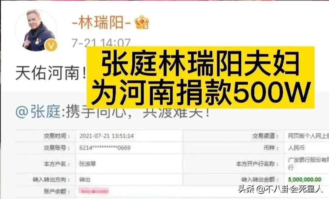 河南灾情的时候,张庭夫妻第一时间捐了500万,成为明星中捐款最多的。