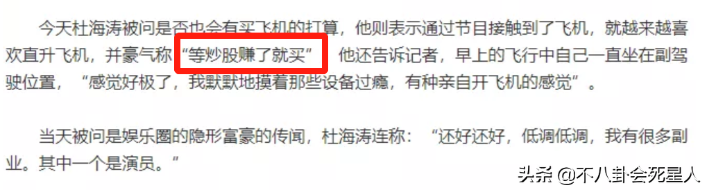 杜海涛曾经透露,自己因为在节目里接触过直升飞机,表示很喜欢,自己还想着要买,不过他也说,等炒股赚了钱再买吧。连买直升飞机的想法也有了,可见杜海涛的实力不俗。
