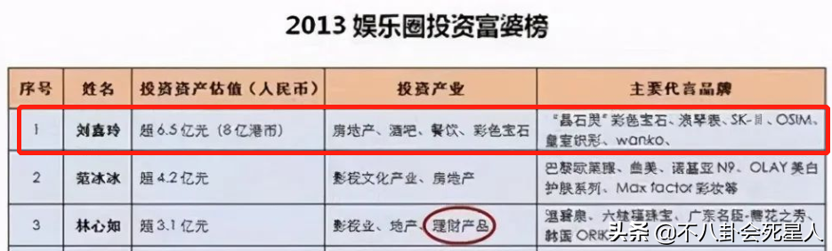 在2013年的“娱乐圈投资富婆榜”上,刘嘉玲排在第一位,她投资的资产估值是8亿台币,折合6.5亿人民币左右。看来外界一直传闻刘嘉玲身家8亿,也不是完全的空穴来风。