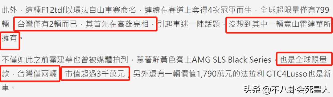 没到50年就处于“半退休”状态的霍建华,除了日常“带女儿”之外,还时不时被媒体拍到开着价值4千万的跑车,而且这种千万以上的跑车,霍建华有三辆。