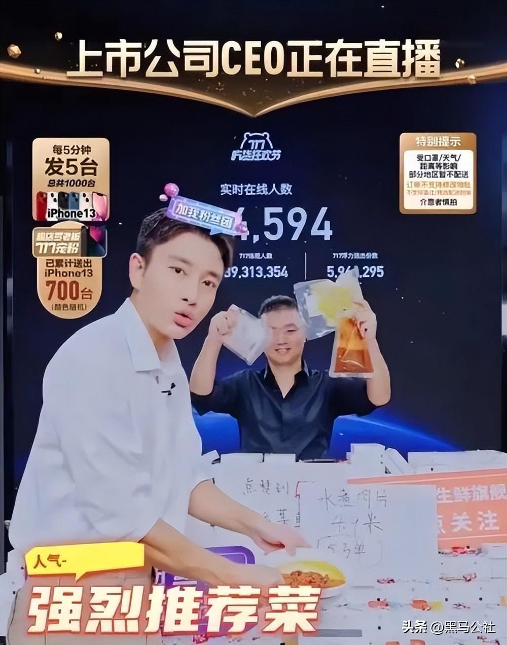 用了百万份的1分钱酸菜鱼和水煮鱼预制菜,以及千台苹果手机来引流,还请到明星贾乃亮坐台。