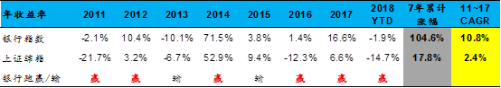 而纵向比较来看,Wind数据显示,银行板块自2011年至2017年七个完整年度的累计涨幅达104.6%,年化收益率10.8%,超越同期上证综指的2.4%。