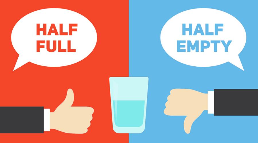 一个装满半杯水的杯子,悲观的人首先看到的是没水的地方,觉的杯子是半空的;而乐观的人懂得满足,他们首先看到的是有水的地方,觉得杯子是半满的。