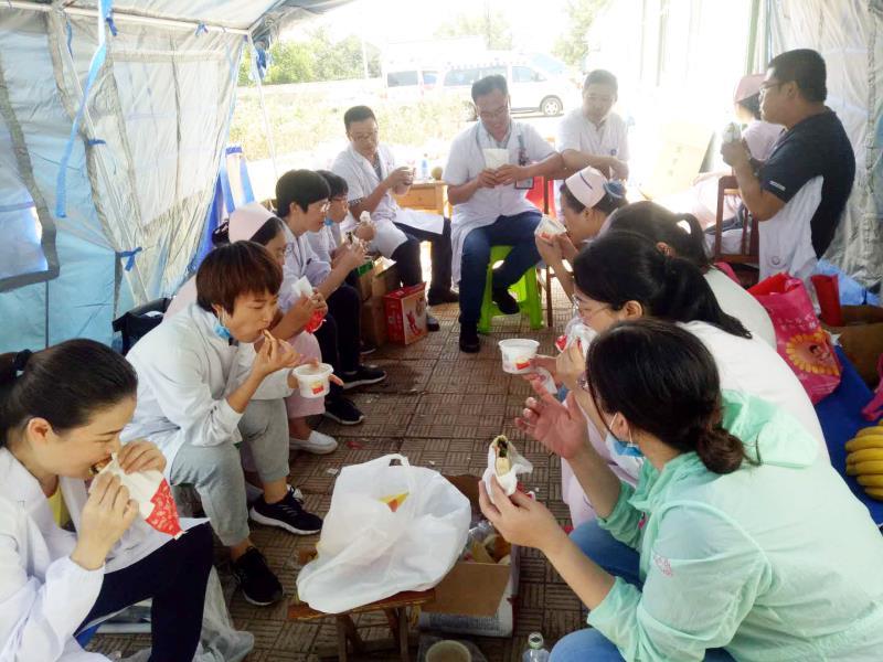 接近中午1时,医疗志愿者才开始吃饭。吃饭那一刻很安静,因为他们已经没有太多力气说话了。