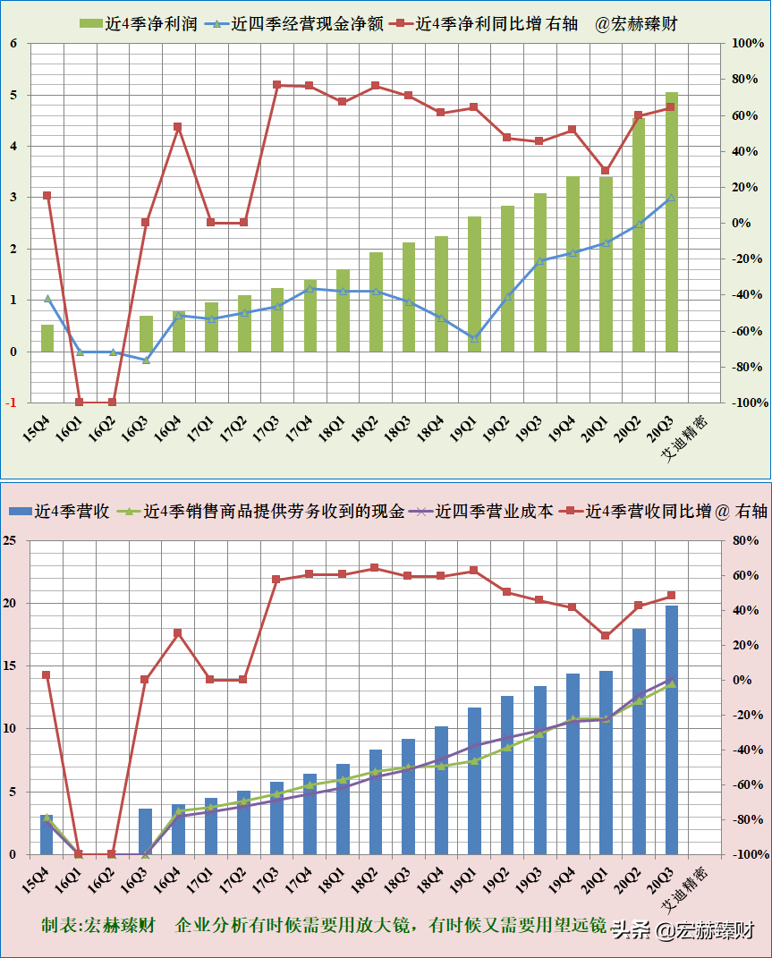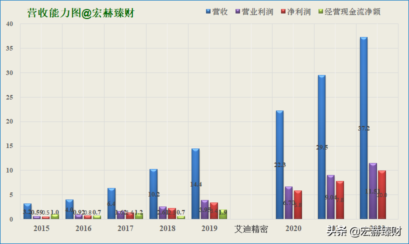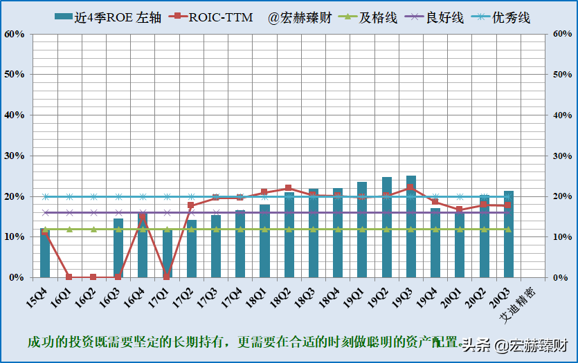 整体来看,艾迪精密上市以来行业和公司都处于上升期,盈利能力较强。ROIC和ROE均在良好线16%以上,未来一致预期向好态势。
