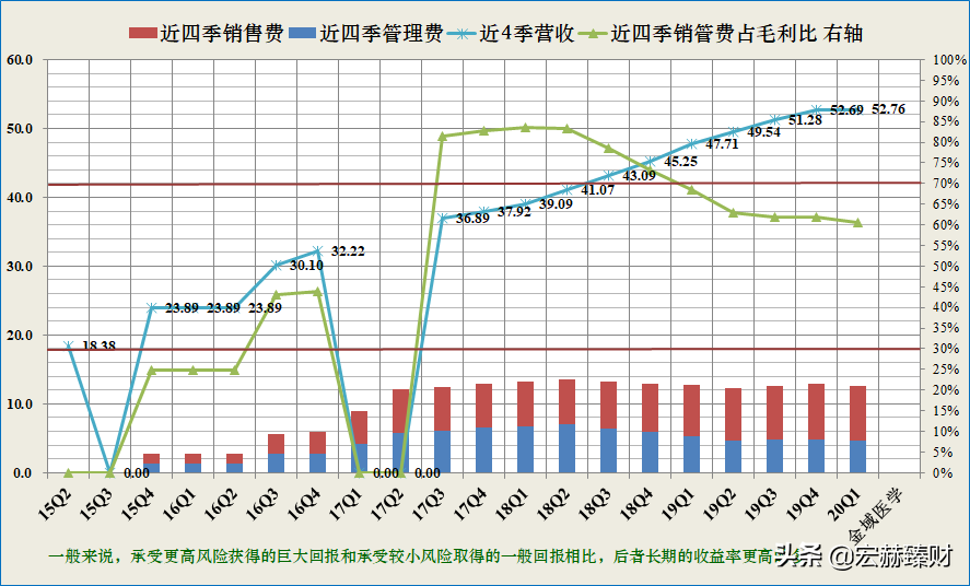 投资者可关注近四季销售和管理费用与毛利润之比持续小于30%的公司(绿线低于下红线为优异,靠近为优秀),具备较高的竞争优势,若30-70%之间为可接受区域(图中红色直线之间),若大于70%需要警惕,说明该公司产生净利润的能力较弱。