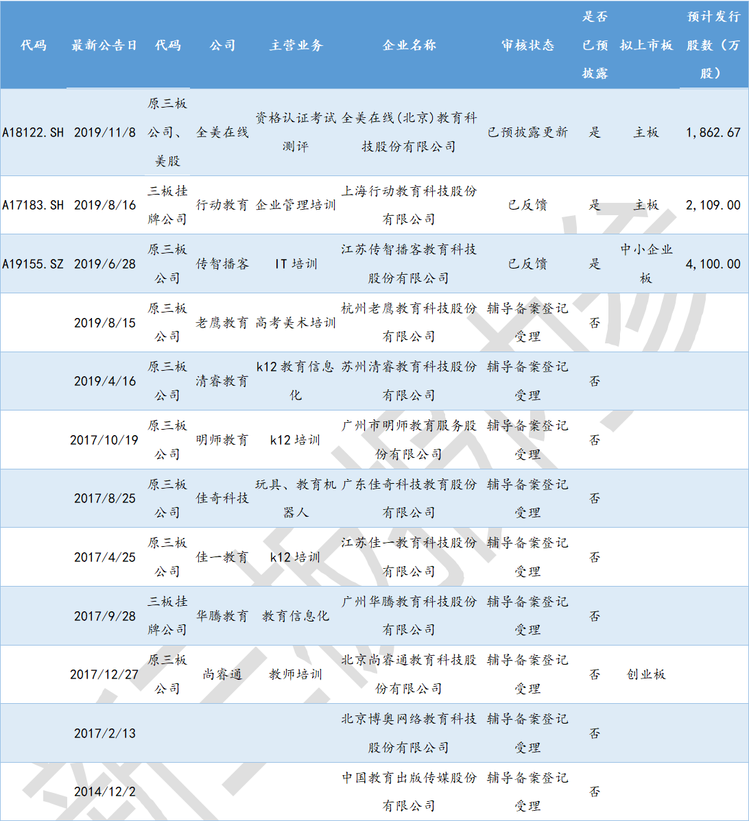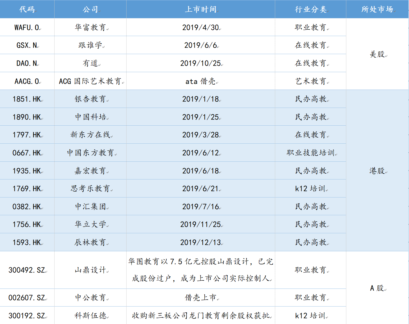 从教育行业IPO情况来看,2019 年新上市教育公司一览表: