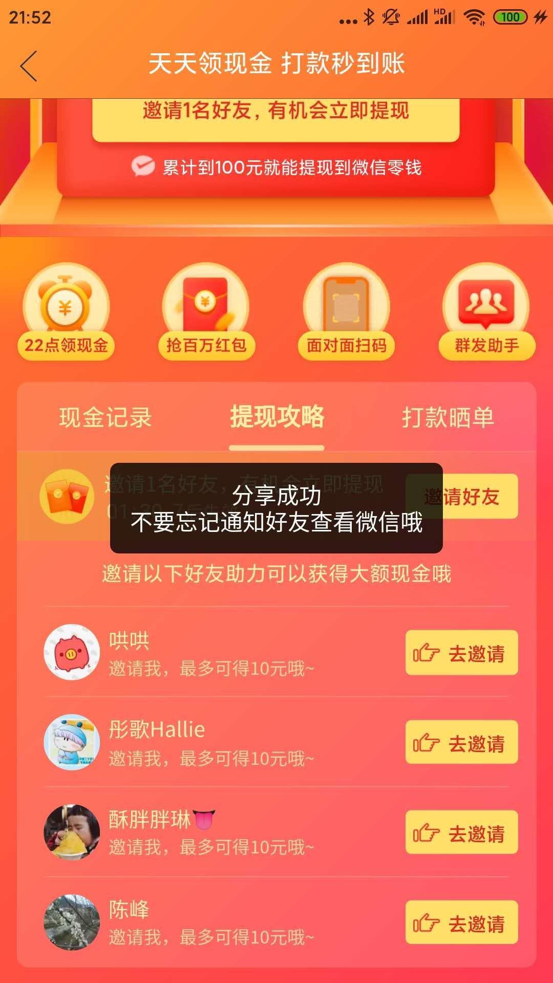 这一步通过弹窗,将提现进度这一关键信息直接呈现到用户眼前。而提现进度的展示,这也会让用户潜意识里觉得自己距离提现已经近在咫尺,从而不知不觉中增强了分享的动力。