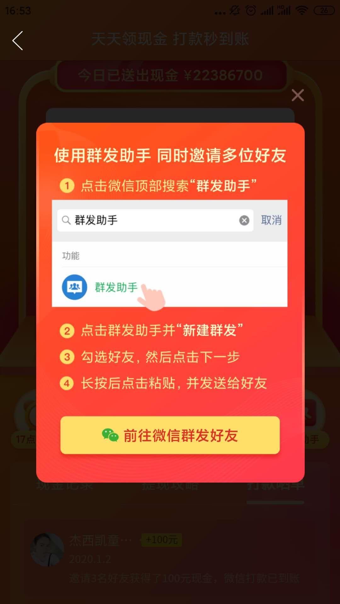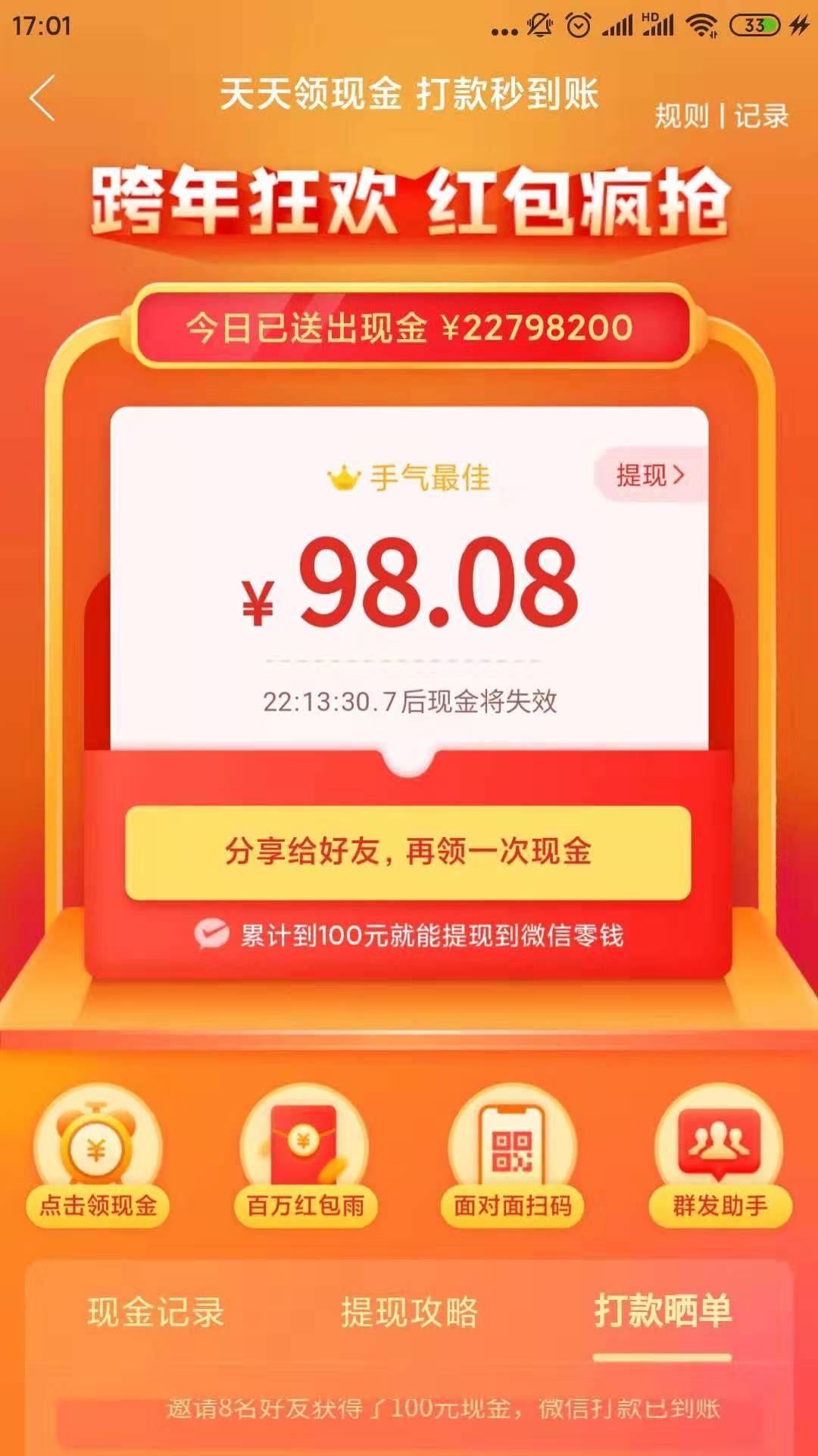 如页面所示,用户会清晰的看到自己所累计领取到的现金金额,此外,页面下部还提供了可以额外领取到现金的4种玩法——点击领现金、抢百万红包、面对面扫码和群发助手。