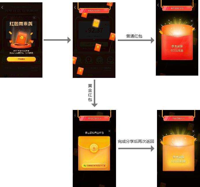 这一链路共5步,涉及3个页面,2个红包弹窗。如果只从数量看,单单进入活动就要分5步,你可能就会觉得这个链路有点过长,但是实际上手体验后,你会发现这些链路环环相扣,细节考究。