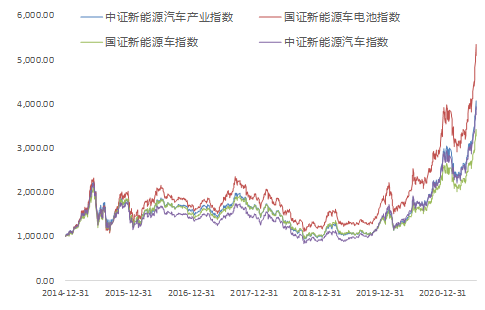 指数的历史走势可以帮助我们对指数的过往业绩表现有一个直观的判断,一般而言,“强者恒强”在股票市场同样适用。如下图中我们将新能源板块的4只代表性指数的历史走势叠加在一起,直观上就能感知