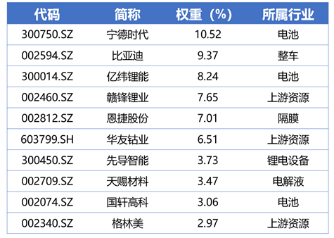 成分券权重是指各个股票所占的比例,其中前10大成份股权重最为人所关注。行业分布是指成分券权重在各个行业的分配情况。我们以国证新能源车电池指数(980032)为例,该指数专注于新能源电池产业的各个子行业,且电池制造、上游资源占据了较大比重,囊括了新能源车电池行业的龙头企业,其行业权重分布来看,电池占比最高(26.71%),其次是上游资源(20.85%),整车(9.37%)。前十大成分券如下: