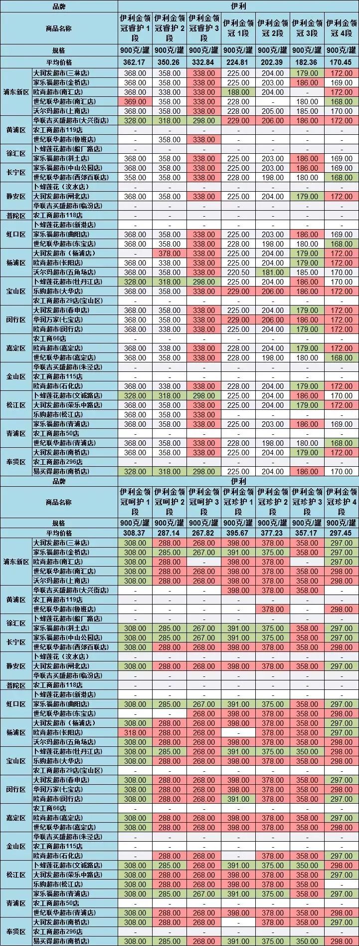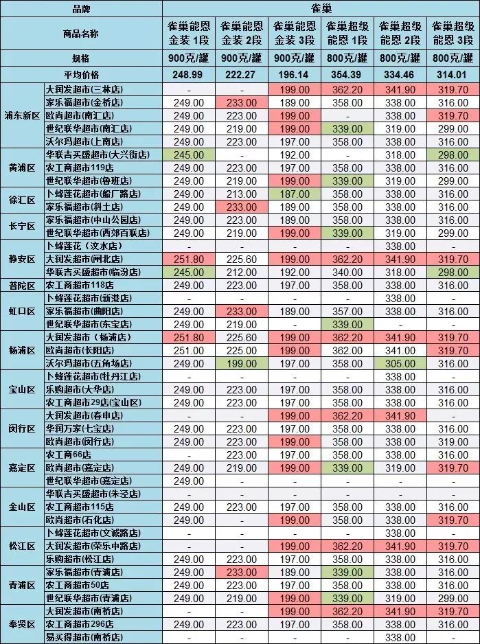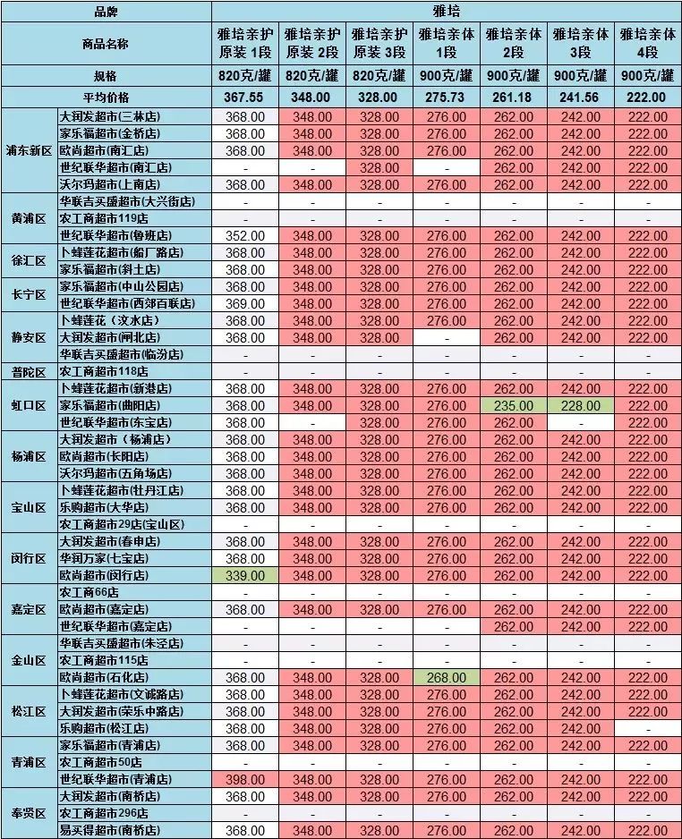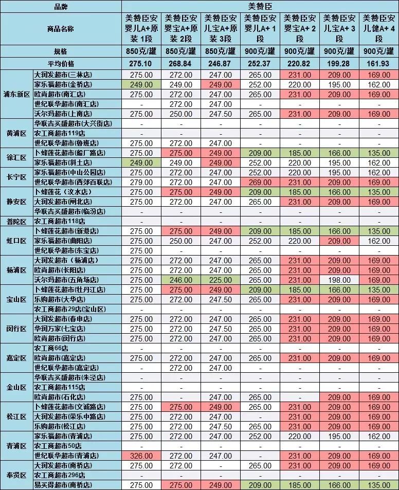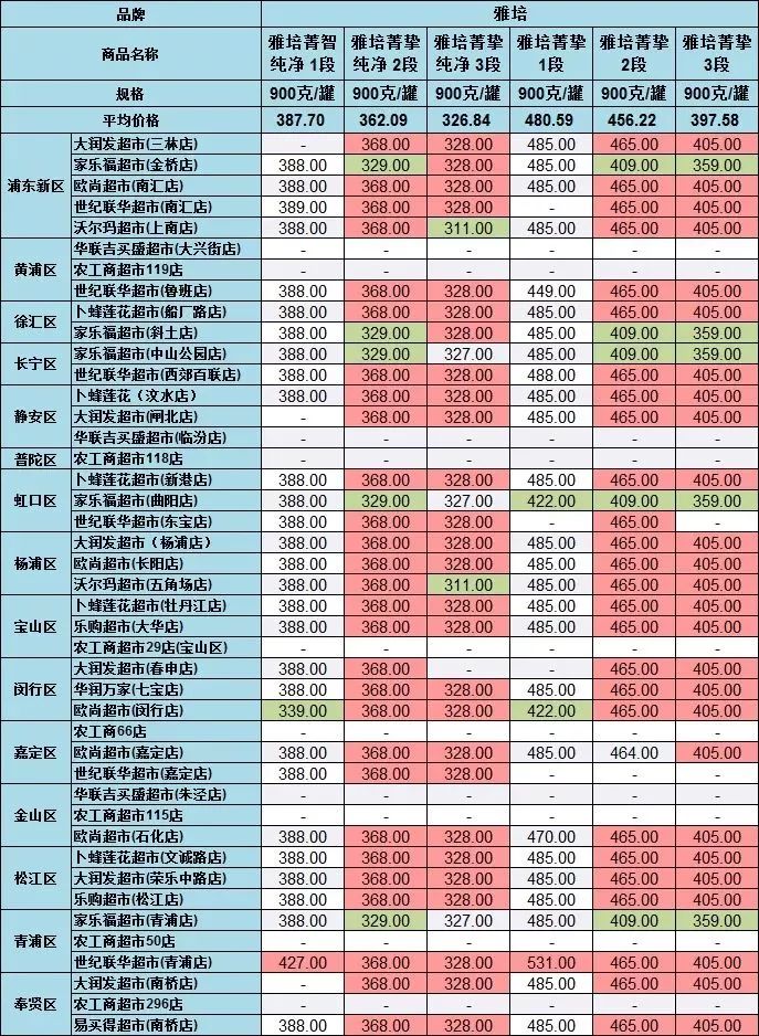 雅培菁挚1段(900克/罐),在世纪联华超市青浦店的售价为531元,在家乐福超市曲阳店、欧尚超市闵行店等售价为422元,差价最大,达109元。