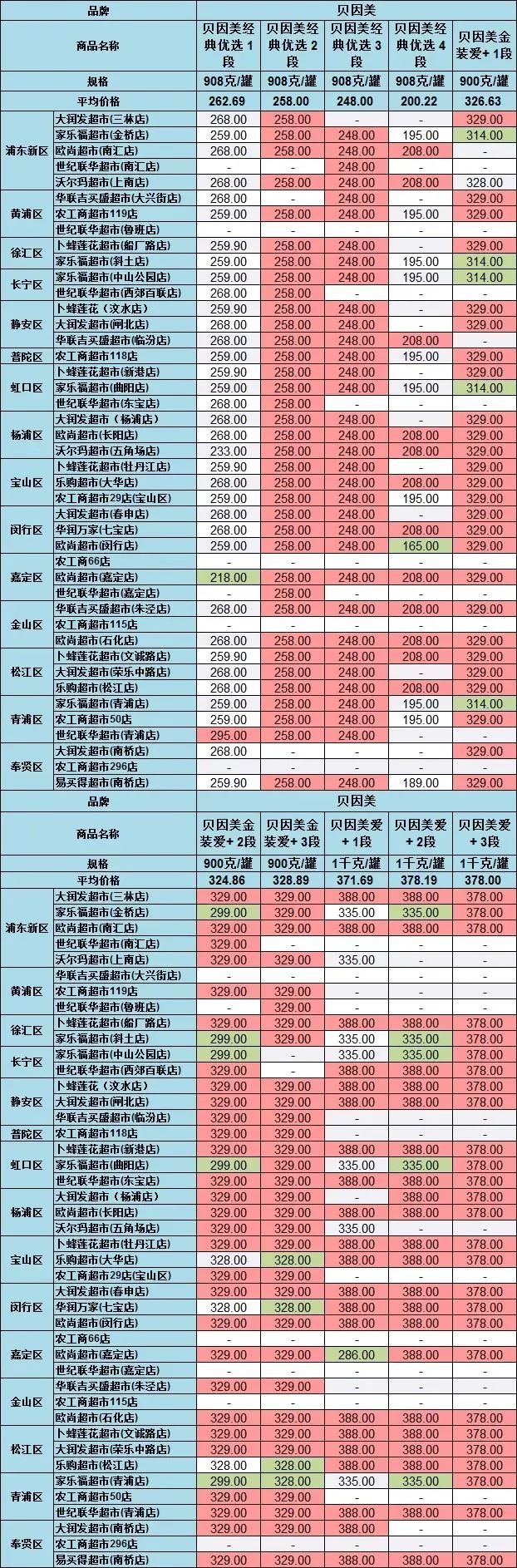 贝因美爱+1段(1千克/罐),在大润发超市三林店、欧尚超市南汇店等售价为388元,在欧尚超市嘉定店售价为286元,差价为102元。