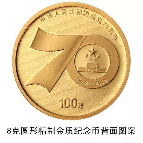 8克圆形金质纪念币背面图案为庆祝中华人民共和国成立70周年活动标识,并刊“中华人民共和国成立70周年”字样及面额。