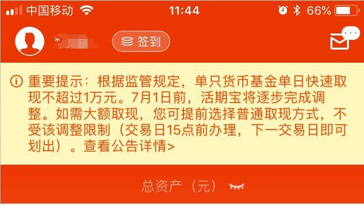 天天基金6月15日公告,活期宝快速取现额度自6月19日起逐步进行调整,将在7月1日前调整完成活期宝的快速取现限额。