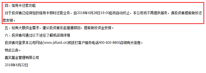 比如嘉实基金此次调整货基的快赎取现限额的同时,关闭了信用卡还款功能。根据嘉实基金公告,投资者已经绑定的信用卡即时还款业务,将于2018年6月28日19点起自动终止,公司将不再提供服务,请投资者提前做好还款安排。