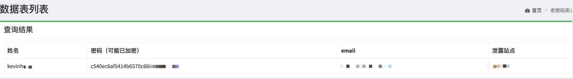 下一步,利用这些数据,我通过“密码库”功能,找到了自己常见的一个密码(经过md5加密)。这个网站还把是哪个平台将我的密码泄漏出来也显示出来了: