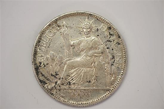 俗称“坐洋”,银币正面主图为自由女神坐像,女神侧身而坐,左手扶椅,右手持杖,旁边为几束生长旺盛的麦穗,在靠椅后面垂挂有象征海洋贸易的船锚。