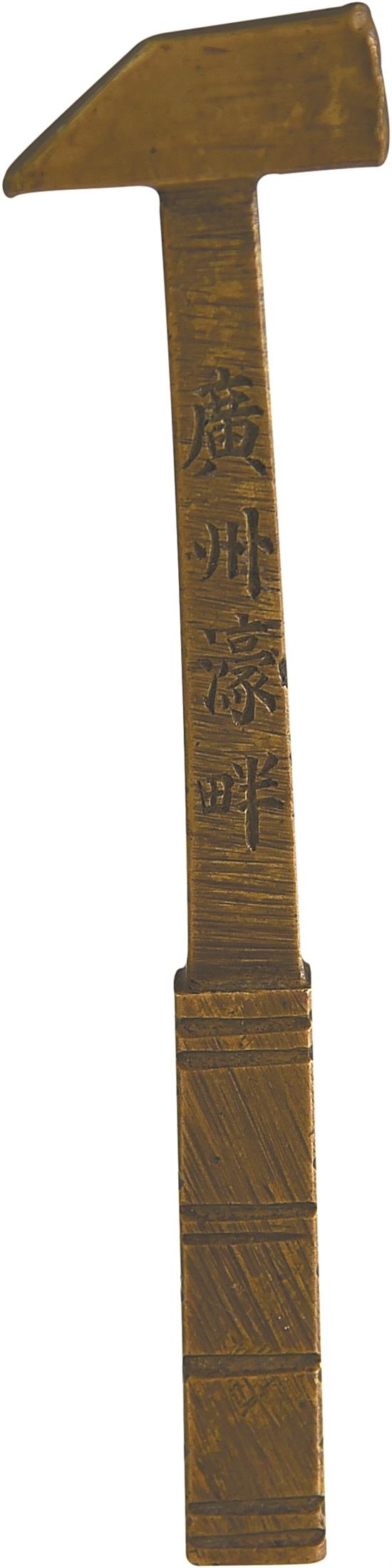 这件藏品是钱庄用的工匠铜锤,其与一般工匠锤相比,特别之处在于侧面书写有文字:广州濠畔。旧日广州濠畔街银号钱庄集聚、货物交易十分繁忙。小小一枚“濠畔”铜锤,折射出广州“小秦淮”的旧日繁华。