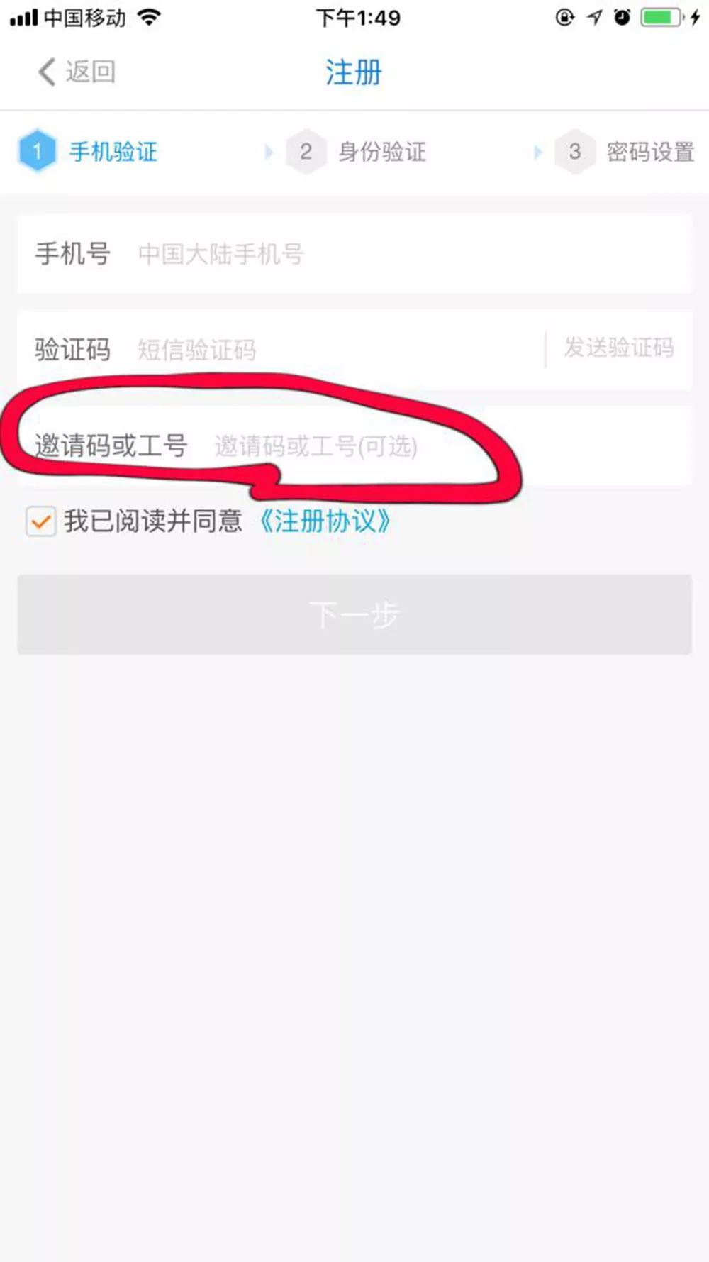 2、点击下图中“注册”按钮,并填写手机号,点击“发送验证码”,按照收到的短信提示准确输入验证码。工号输入102671!!!勾选“我已阅读并同意《注册协议》”,点击下一步。