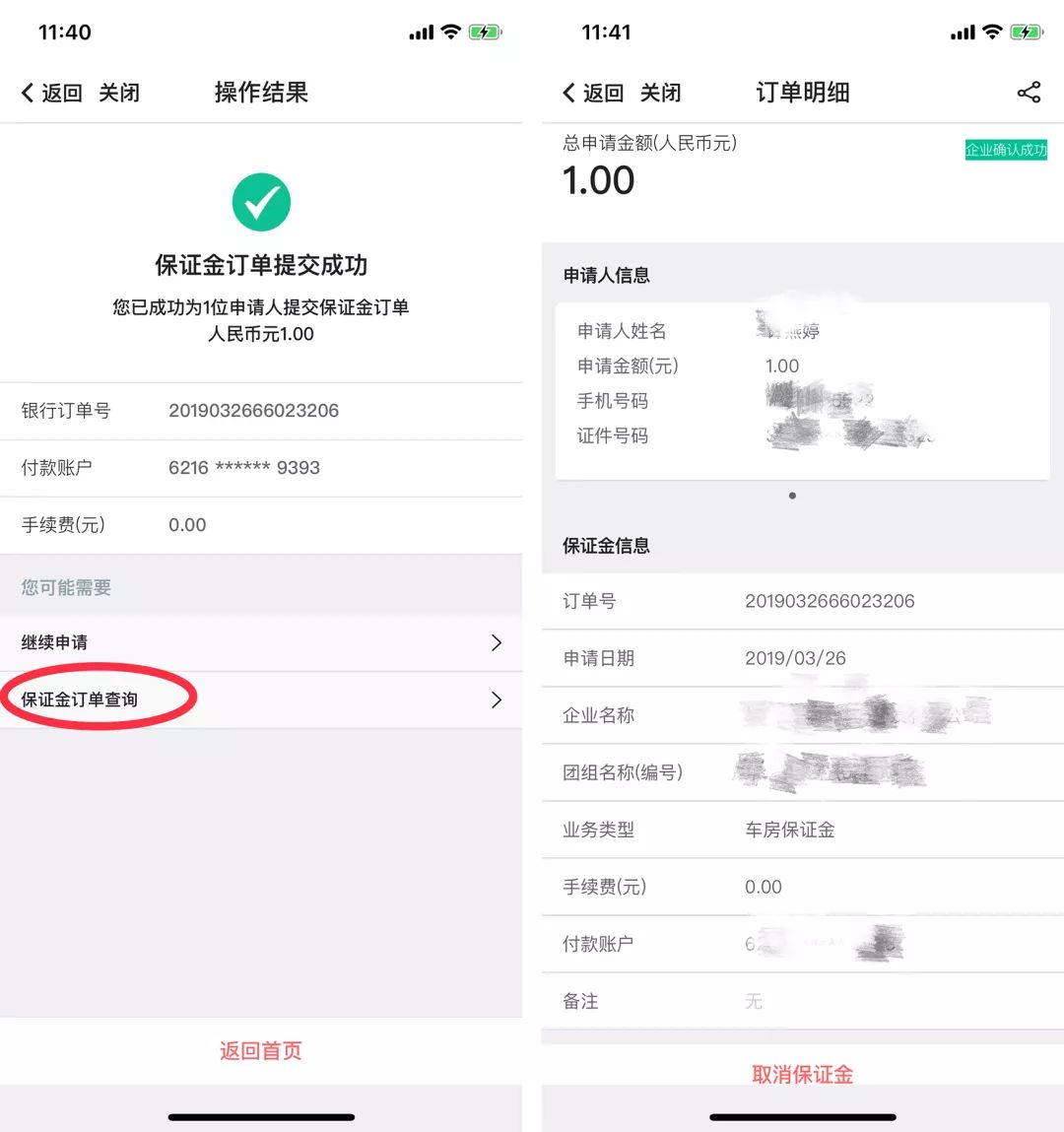(5)缴存成功后,将进入“保证金查询”界面。点击保证金订单查询,按照时间和业务类型筛选订单,选择一笔进入订单明细界面。