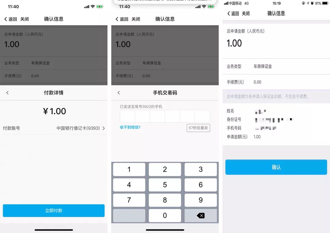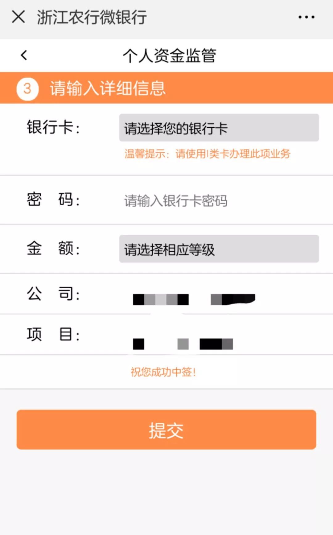 七、选择绑定的银行卡,输入密码,选择相应冻结金额等级,核对信息点击“提交”。满足保证金金额将提示“交易成功”,即流程结束。若提示“可用余额不足”,请补足金额后重新开始操作。