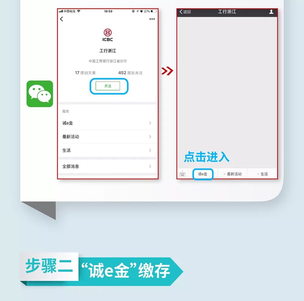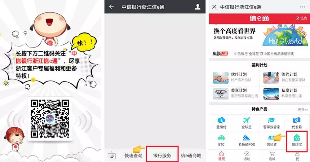 第一步、长按下图二维码关注中信银行官方公众号“中信银行浙江信e通”,依次点击【银行服务】-【信约宝】。