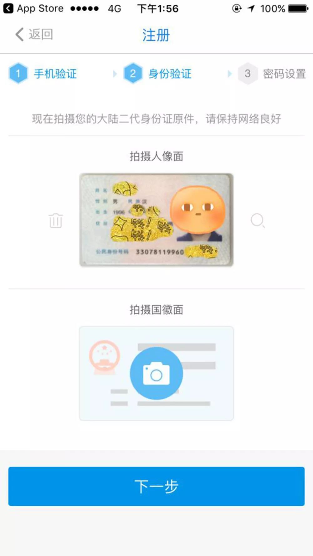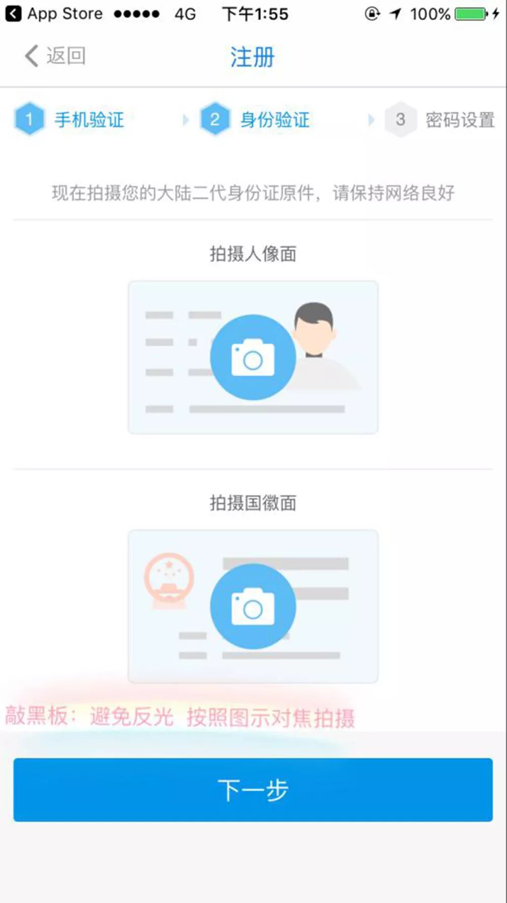 3、准备好身份证原件,并保持网络良好状态,按照下图所示拍摄身份证正反面,避免反光出现光斑,若所拍照片不理想,可点击照片左侧的小图标进行删除,拍摄完毕后点击下一步。